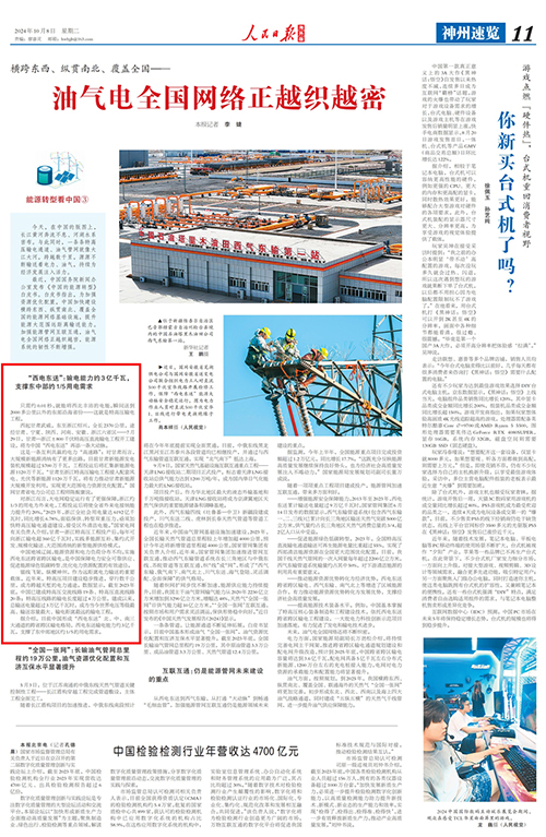 近日,國網(wǎng)安徽蕪湖供電公司與國網(wǎng)安徽省送變電公司聯(lián)合組織電力工人對直流500千伏宜華線路開展檢修工作,保障“西電東送”能源大動脈安全穩(wěn)定運行。圖為電力作業(yè)人員對直流500千伏宜華I、II線進行帶電更換絕緣子工作。 今天,在中國的版圖上,長江黃河奔流不息、河湖水系密布。與此同時,一條條特高壓輸電通道、油氣管網(wǎng)就像大江大河,跨越數(shù)千里,源源不斷輸送著電力、油氣,持續(xù)為經(jīng)濟發(fā)展注入活力。 最近,中國國務(wù)院新聞辦公室發(fā)布《中國的能源轉(zhuǎn)型》白皮書。白皮書指出,為加強資源優(yōu)化配置,中國加快建設(shè)橫跨東西、縱貫?zāi)媳?、覆蓋全國的能源網(wǎng)絡(luò)基礎(chǔ)設(shè)施,提升能源大范圍遠(yuǎn)距離輸送能力。 “西電東送”:輸電能力約3億千瓦,支撐東中部約1/5用電需求 只需約0.01秒,就能將西北豐沛的電能,瞬間送到2000多公里以外的東部沿海省份——這就是特高壓輸電工程。 西起甘肅武威,東至浙江紹興,全長2370公里,途經(jīng)甘肅、寧夏、陜西、河南、安徽、浙江六省區(qū)——7月29日,甘肅—浙江±800千伏特高壓直流輸電工程開工建設(shè),將為中國“西電東送”再添一條大動脈。 這是一條互利共贏的電力“高速路”:對甘肅而言,大規(guī)模新能源消納有了更多出路。目前甘肅新能源發(fā)電裝機規(guī)模超過5700萬千瓦,工程投運后將匯集新能源電源1120萬千瓦?!案拭C至浙江特高壓輸電工程接入配套風(fēng)電、光伏等新能源1120萬千瓦,將有力推動甘肅新能源大規(guī)模開發(fā)利用,實現(xiàn)更大范圍電力資源優(yōu)化配置?!眹W(wǎng)甘肅省電力公司總工程師陳振寰說。 對浙江而言,大電網(wǎng)穩(wěn)定運行有了更強保障。浙江約1/3的用電為外來電,工程投運后將使全省外來電接納能力提升約20%?!?023年,浙江全社會用電量達(dá)6192億千瓦時,同比增長6.78%,面臨保供、轉(zhuǎn)型雙重壓力,亟須加快特高壓輸電通道建設(shè),接受區(qū)外清潔電能。”國家電網(wǎng)有關(guān)負(fù)責(zé)人介紹,甘肅—浙江特高壓工程投產(chǎn)后,每年可向浙江輸電超360億千瓦時,實踐多能源互補、集約式開發(fā)、規(guī)?;斔?、大范圍消納的新型能源供給模式。 中國地域遼闊,能源資源和電力負(fù)荷分布不均。實施西電東送跨省跨區(qū)輸電,是中國保障電力安全可靠供應(yīng)、促進能源綠色低碳轉(zhuǎn)型、優(yōu)化電力資源配置的有效途徑。 銀線飛架,縱橫神州,作為遠(yuǎn)距離電力輸送的重要載體,近年來,特高壓項目建設(shè)穩(wěn)步推進,穿行數(shù)千公里,成為跨越天塹的電力通途。數(shù)據(jù)顯示,截至2023年底,中國已建成特高壓交流線路19條、特高壓直流線路20條;特高壓線路的輸電長度超過4萬公里,建成以來,總輸送電量超過3萬億千瓦時,成為當(dāng)今世界電壓等級最高、輸送容量最大、輸電距離最遠(yuǎn)的輸電工程。 據(jù)介紹,目前中國形成“西電東送”北、中、南三大通道的跨省跨區(qū)輸電格局,西電東送輸電能力約3億千瓦,支撐了東中部地區(qū)約1/5的用電需求。 ?。ū疚恼幱凇度嗣袢請蟆泛M獍?024年10月8日11版)
