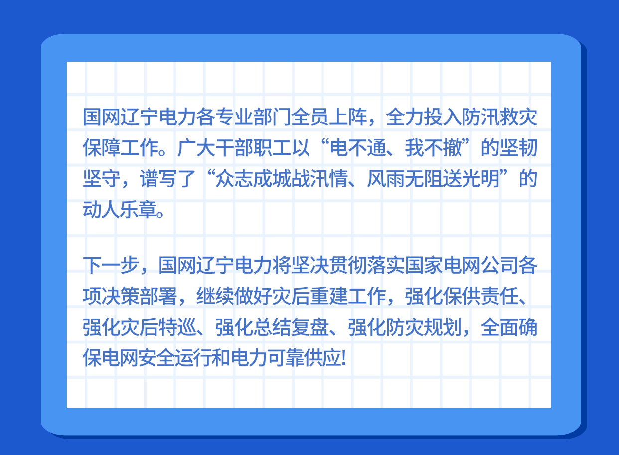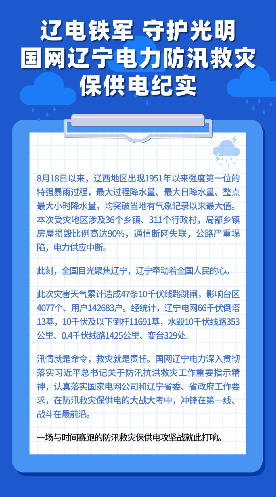 國(guó)家電網(wǎng)公司高度重視遼寧災(zāi)情,要求國(guó)網(wǎng)遼寧電力積極配合各級(jí)政府做好防汛救災(zāi)工作。國(guó)網(wǎng)遼寧電力開展重點(diǎn)變電站、重要線路特巡和應(yīng)急處置,以最快速度排出所有變電站積水,確保主網(wǎng)和電力通訊專網(wǎng)始終穩(wěn)定運(yùn)行。 8月20日 9時(shí) 國(guó)網(wǎng)遼寧電力緊急開展防汛應(yīng)急會(huì)商,啟動(dòng)防汛Ⅳ級(jí)應(yīng)急響應(yīng),主要領(lǐng)導(dǎo)靠前指揮,省市縣三級(jí)應(yīng)急指揮中心迅速行動(dòng),全面部署葫蘆島、朝陽(yáng)等受災(zāi)地區(qū)的防汛搶險(xiǎn)工作。 14時(shí)30分 利用電力通信線路,為建昌縣政府應(yīng)急指揮部成功裝設(shè)2部固定電話,打通了對(duì)外聯(lián)絡(luò)的最早通道。 15時(shí) 開展第二次遼西地區(qū)防汛視頻會(huì)商,迅速組建防汛救災(zāi)保供電現(xiàn)場(chǎng)指揮部,“清單化”梳理防汛救援、應(yīng)急搶修等需求,緊急調(diào)配應(yīng)急搶修資源。 16時(shí) 201支搶修隊(duì)伍、2739名搶修人員,734臺(tái)車輛、63臺(tái)發(fā)電車、148臺(tái)發(fā)電機(jī)、145臺(tái)配電變壓器等應(yīng)急搶修物資集結(jié)待命,陸續(xù)趕往受災(zāi)一線。 朝陽(yáng)燕山湖發(fā)電廠自維配電室進(jìn)線電纜發(fā)生故障,國(guó)家電網(wǎng)遼寧電力(朝陽(yáng))雷鋒共產(chǎn)黨員服務(wù)隊(duì)立即前往現(xiàn)場(chǎng),利用低壓發(fā)電車第一時(shí)間滿足燕山湖發(fā)電廠用電負(fù)荷。 國(guó)網(wǎng)朝陽(yáng)供電公司組織配電專業(yè)人員在強(qiáng)降雨過后,開展線路巡視工作,保障電力可靠供應(yīng)。 國(guó)網(wǎng)建昌縣供電公司員工在建昌縣安居樓幫助轉(zhuǎn)移受災(zāi)群眾。 葫蘆島建昌地區(qū)因暴雨導(dǎo)致通信中斷,無法與外面取得聯(lián)系,一時(shí)間成為信號(hào)“孤島”。國(guó)網(wǎng)遼寧信通公司迅速啟動(dòng)通信應(yīng)急預(yù)案,組織通信搶修隊(duì)伍第一時(shí)間趕往受災(zāi)現(xiàn)場(chǎng),努力做好電力通信聯(lián)絡(luò)保障。 8月21日,在葫蘆島市建昌縣抗洪搶險(xiǎn)一線,遼寧省委書記、省人大常委會(huì)主任郝鵬聽取國(guó)網(wǎng)遼寧電力負(fù)責(zé)人關(guān)于電網(wǎng)設(shè)備受災(zāi)情況及應(yīng)急搶修復(fù)電工作開展情況的匯報(bào),對(duì)國(guó)家電網(wǎng)公司黨組積極支持遼寧搶險(xiǎn)救災(zāi)工作及國(guó)網(wǎng)遼寧電力全力開展應(yīng)急搶修復(fù)電給予充分肯定和高度評(píng)價(jià),同時(shí)向奮戰(zhàn)在抗洪搶險(xiǎn)一線的廣大干部職工表示誠(chéng)摯慰問。 8月21日 國(guó)網(wǎng)電力空間技術(shù)有限公司的直升機(jī)組落地建昌縣,做好應(yīng)急通道巡檢和物資吊運(yùn)工作準(zhǔn)備。天津公司支援隊(duì)沖鋒舟到達(dá)綏中,保障水上物資運(yùn)送暢通。 國(guó)家電網(wǎng)公司組織國(guó)網(wǎng)電力空間技術(shù)有限公司調(diào)派的貝爾429直升機(jī)落地遼寧葫蘆島建昌,將開展應(yīng)急通道巡檢、綜合檢修和發(fā)電機(jī)等物資運(yùn)輸?shù)葥屝迯?fù)電工作。 國(guó)網(wǎng)電力空間技術(shù)有限公司大型無人機(jī)順利起飛,前往巡檢并拍攝遼寧葫蘆島建昌地區(qū)的66千伏朱家線受損情況,為國(guó)網(wǎng)遼寧省電力有限公司后續(xù)搶修復(fù)電做好充分準(zhǔn)備。 19時(shí)50分 國(guó)網(wǎng)葫蘆島供電公司搶修隊(duì)伍對(duì)10千伏煤礦線湯土溝分支05號(hào)桿真空開關(guān)進(jìn)行送電。 23時(shí) 國(guó)網(wǎng)葫蘆島供電公司搶修隊(duì)伍連夜組裝金具,架設(shè)10千伏秋子溝線明水線13號(hào)桿,全力恢復(fù)損毀線路。 23時(shí)55分 國(guó)網(wǎng)葫蘆島供電公司應(yīng)急搶修隊(duì)伍在10千伏秋子溝鄉(xiāng)和明水鄉(xiāng)主干線的搶修現(xiàn)場(chǎng),對(duì)新架設(shè)的桿塔綁扎絕緣子瓶。 國(guó)網(wǎng)北京、天津、河北、冀北、山東、空間技術(shù)公司等單位,火速馳援遼寧;電力氣象預(yù)警中心開展24小時(shí)聯(lián)合值班值守,與省氣象局專家聯(lián)合研判,每4小時(shí)實(shí)時(shí)更新天氣實(shí)況與預(yù)警;來自省內(nèi)各地的搶修救援隊(duì)伍,奮戰(zhàn)在遼西災(zāi)區(qū),開山辟路,立桿架線,連續(xù)奮戰(zhàn),為防汛救災(zāi)搶修復(fù)電提供有力支撐。 8月22日 5時(shí) 國(guó)網(wǎng)建昌縣供電公司路旁的應(yīng)急發(fā)電車隊(duì)及大型機(jī)械搶修隊(duì)伍隨時(shí)機(jī)動(dòng)待命。 7時(shí) 國(guó)網(wǎng)葫蘆島供電公司搶修隊(duì)伍正在建昌縣石佛鄉(xiāng)白狼山村10千伏煤礦線湯土溝分支,開展跨海架線搶修作業(yè)。 9時(shí) 在喇嘛洞鎮(zhèn)石柱溝屯河道兩側(cè),國(guó)網(wǎng)建昌縣供電公司喇嘛洞鎮(zhèn)供電所員工們正在對(duì)10千伏堿賀線喇嘛洞一線倒桿的主干線路及跨河分歧進(jìn)行搶修。 10時(shí) 截至22日10時(shí),國(guó)網(wǎng)電力空間技術(shù)有限公司累計(jì)出動(dòng)人員585人次、各類無人機(jī)58臺(tái),飛行174架次,飛行里程870千米,拍攝圖片、影像3356張,基本災(zāi)損情況已排查完畢。 16時(shí) 國(guó)網(wǎng)天津市電力公司應(yīng)急搶修隊(duì)在遼寧省葫蘆島市綏中縣明水鄉(xiāng)和秋子溝鄉(xiāng)的交界處,駕駛沖鋒舟進(jìn)